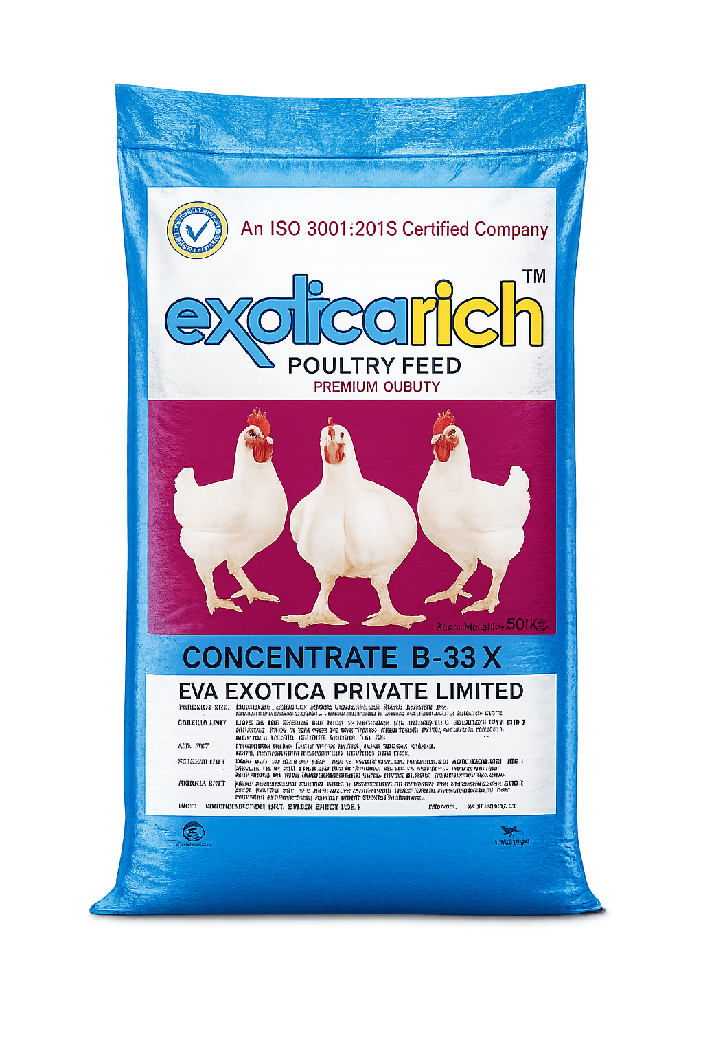 Exoticarich™ Concentrate B-33 X is a high-performance poultry feed designed to support optimal growth, health, and productivity in poultry. Manufactured by EVA Exotica Private Limited, an ISO 9001:2015 certified company, this feed ensures consistent quality and reliability for modern poultry farming.